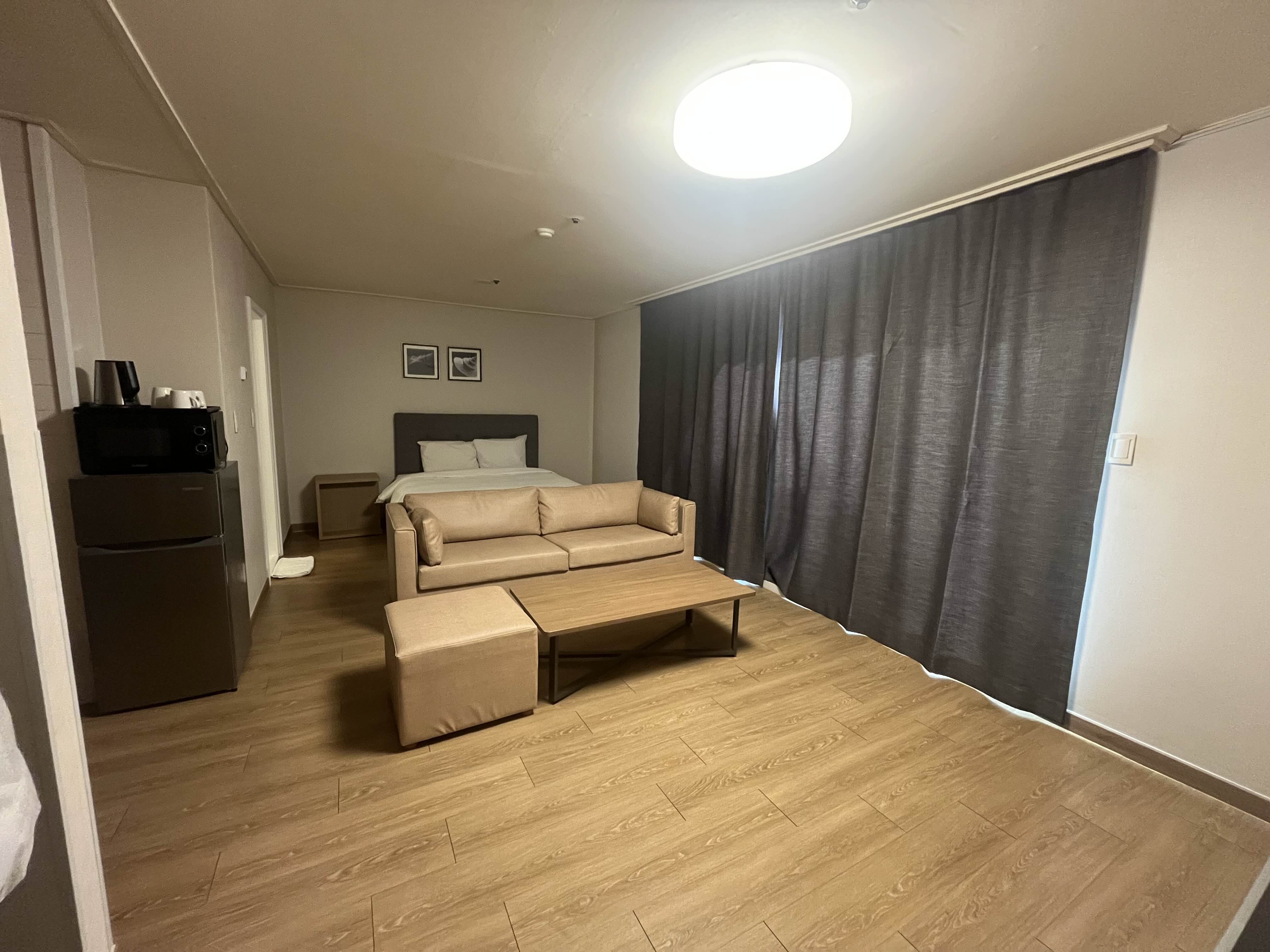 전자레인지와 큰 냉장고가 있어 아이 간식과 식사 준비가 편했고, 객실 면적이 넉넉해 실내에서도 아이가 움직이며 놀기 좋았습니다.