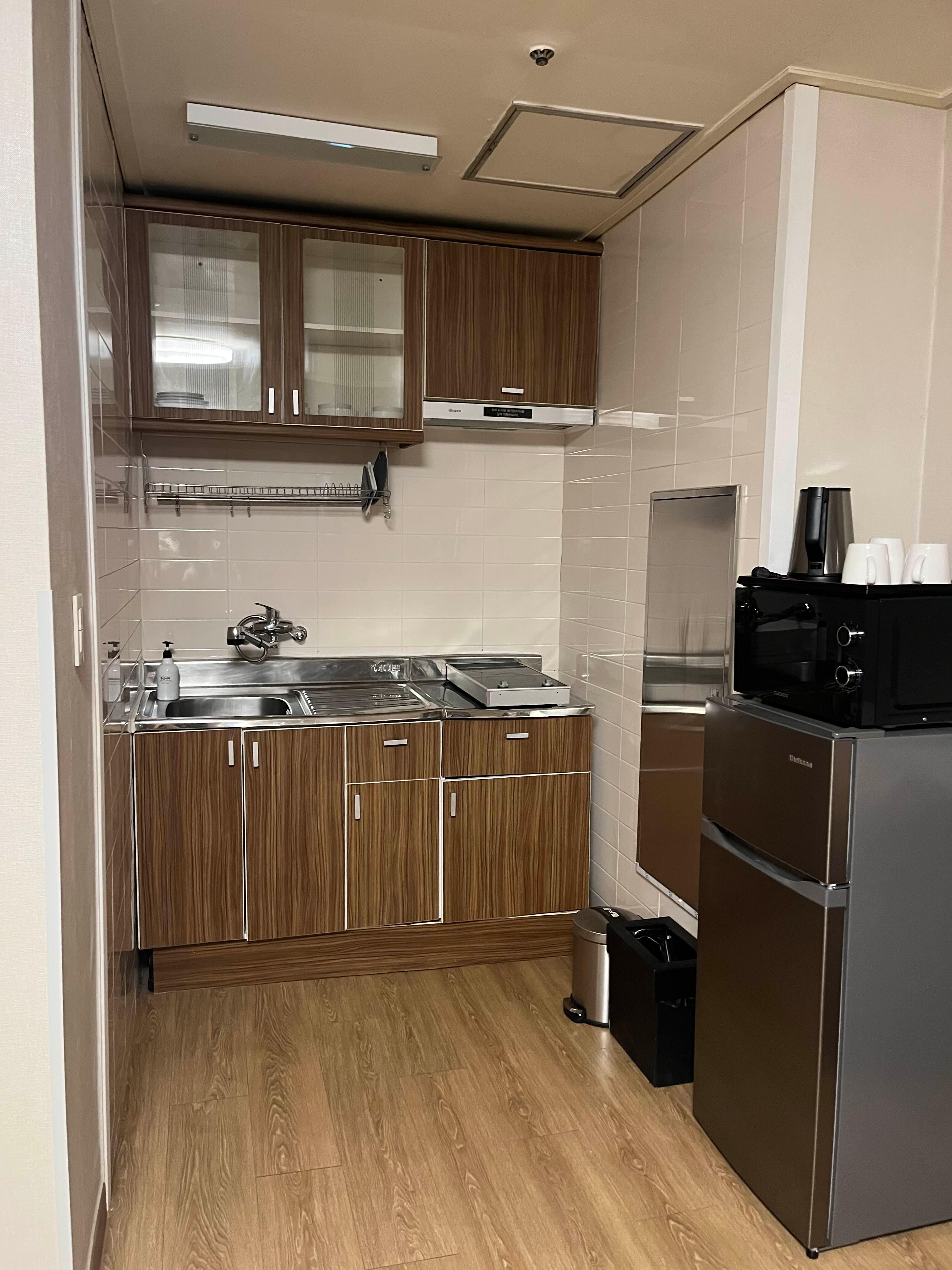 • 취사 및 편의시설: 취사 가능 객실의 경우 싱크대와 하이라이트가 구비되어 있습니다. 특히 냉장고가 일반 호텔 미니바보다 큰 사이즈라 이유식이나 간식을 넉넉히 보관할 수 있고, 무엇보다 객실 내 전자레인지가 있어 햇반이나 아이들 음식을 데우기에 매우 편리합니다.