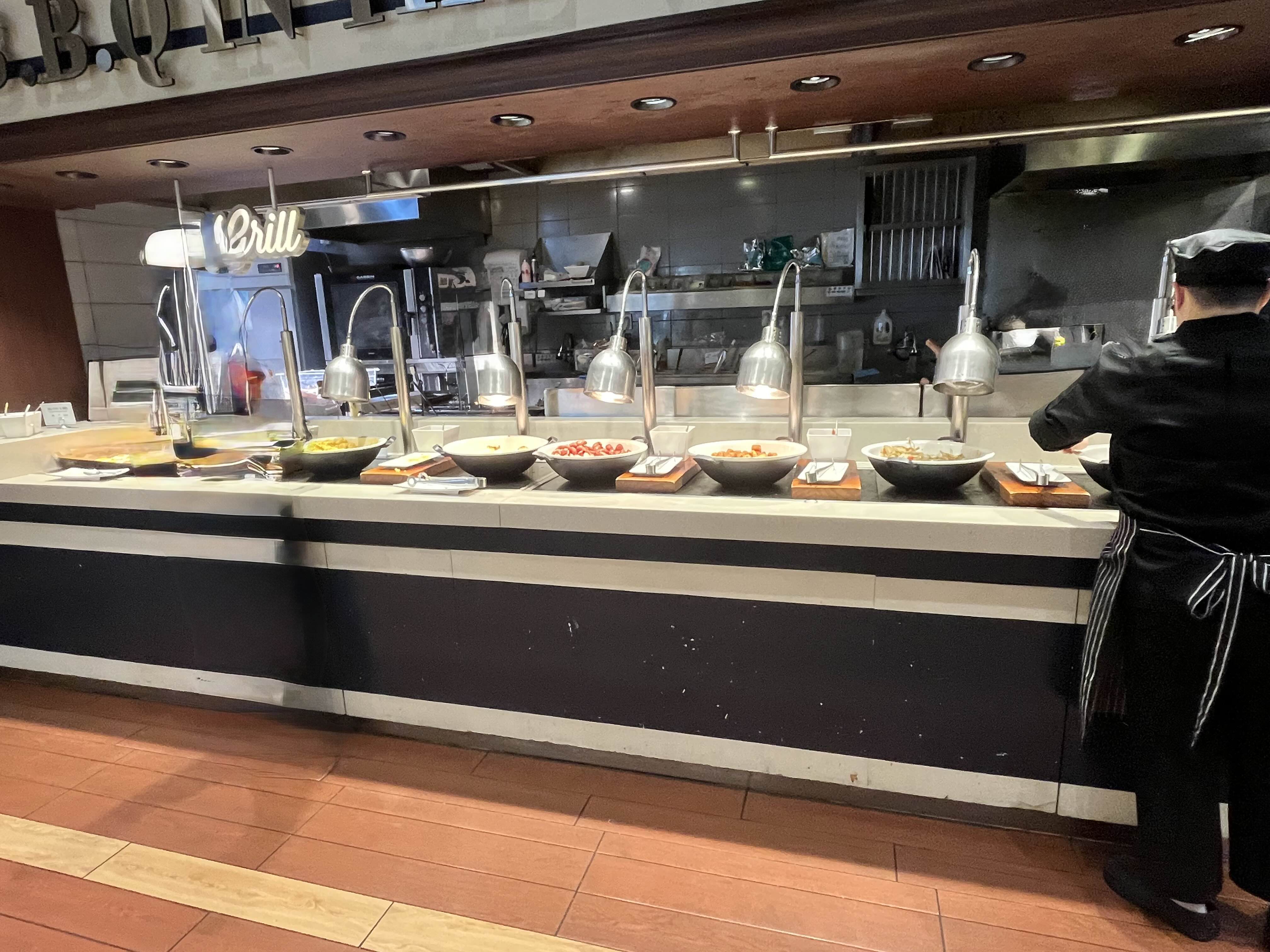 뷔페 음식 진열대 근처는 아무래도 사람들이 많아 조금 북적이는 편이에요. 만약 조금 더 차분한 분위기에서 식사하고 싶으시다면 입구에서 왼쪽으로 꺾어 깊숙이 들어가기! 뷔페 메인 공간과는 거리가 조금 떨어져 있지만, 안쪽으로 깊게 들어가면 사람들이 붐비지 않는 넓은 공간이 나옵니다. 음식을 가지러 가는 동선은 조금 길어질 수 있지만, 훨씬 조용하고 쾌적하게 식사에 집중할 수 있어서 저는 개인적으로 이 안쪽 자리가 참 좋더라고요.