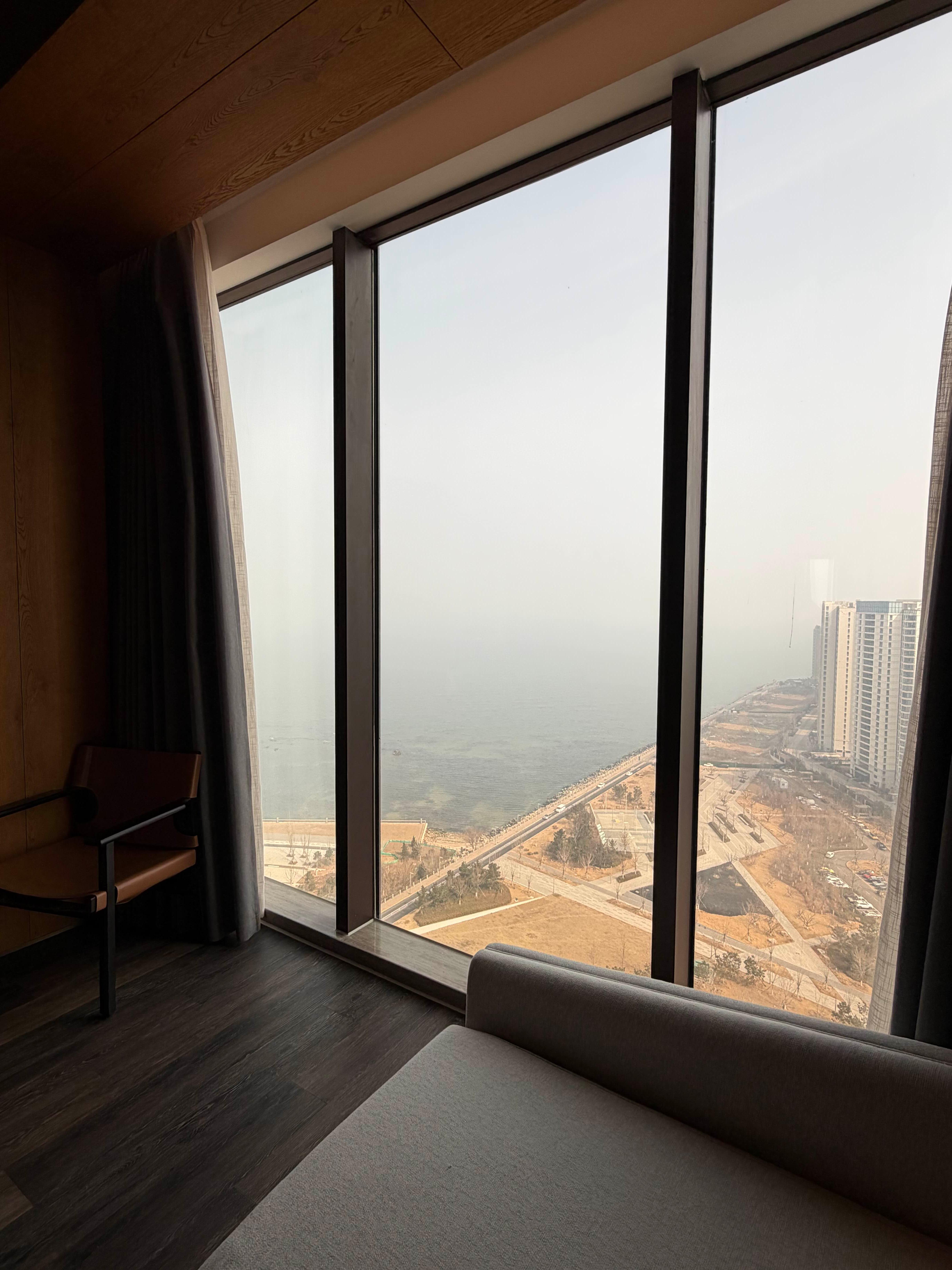 - 스마트한 첫인상: 객실에 들어서자마자 외출 중에 닫혀있던 커튼이 스르륵 열리며 시원한 오션뷰를 보여주는데, 마치 호텔이 저를 환영해 주는 기분이었어요. 특히 인상적이었던 건, 해 질 녘이 되면 따로 조절하지 않아도 자동으로 커튼이 닫히더라고요. 투숙객이 일일이 신경 쓰지 않아도 시간에 맞춰 채광을 조절해 주는 시스템에서 '아, 역시 웨스틴이구나' 싶었습니다. 또 높은 층에서 바라보는 연태 바다의 풍경이 자동 커튼과 만나니 훨씬 더 고급스러운 영화 속 한 장면 같았지만, 미세먼지가 심해서 감동이 덜 했습니다.😭