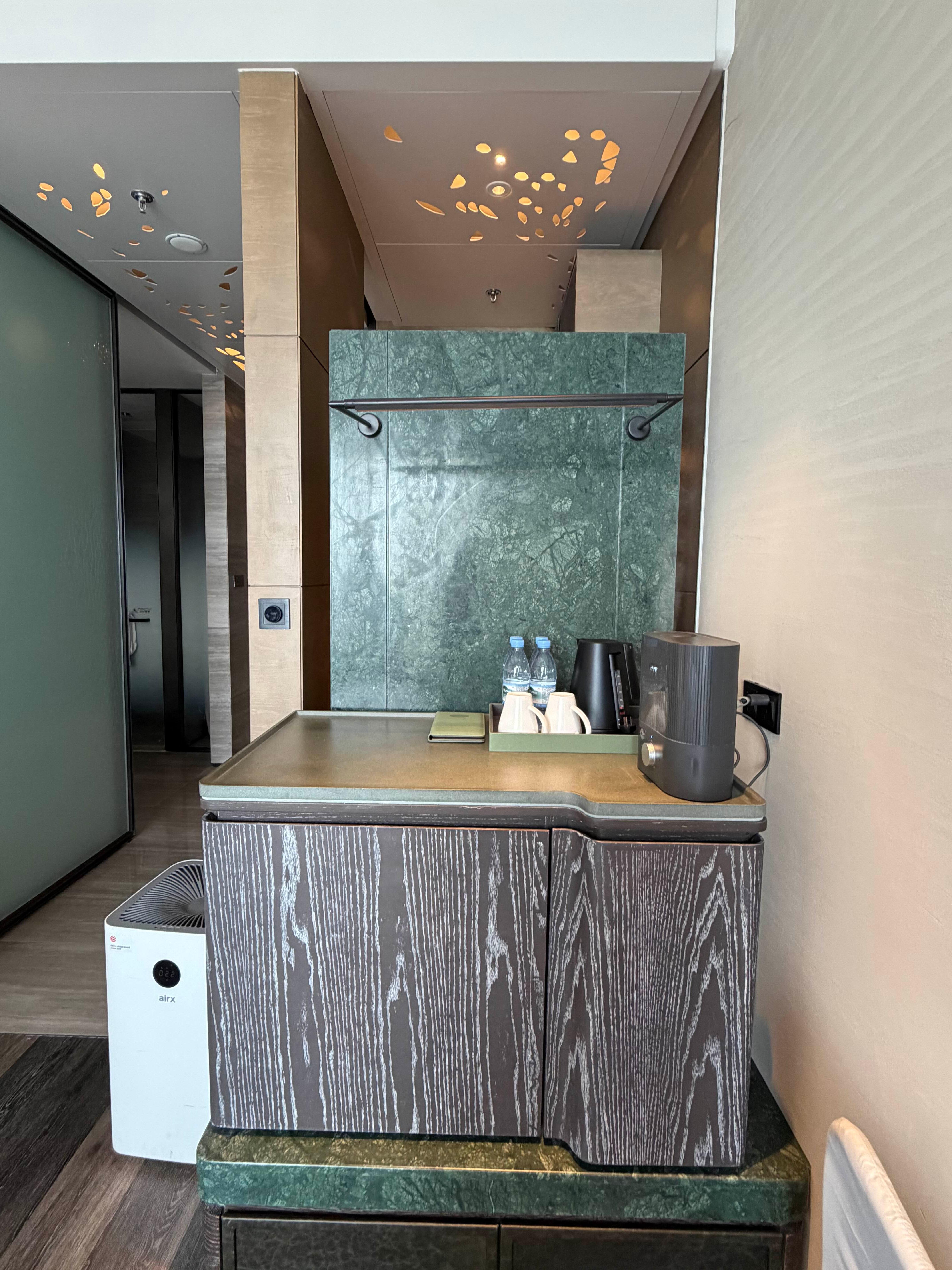 - 욕실 앞 드레스룸 : 연태 웨스틴 객실은 욕실 앞에 옷장과 수납장, 캐리어선반이 작지만 룸처럼 있어요. 샤워하고 나와서 바로 옷을 갈아입을 수 있어 동선이 정말 편했고, 무엇보다 어질러진 짐들이 침실에서는 보이지 않아 룸 컨디션을 끝까지 깔끔하게 유지할 수 있었답니다. 신축 호텔답게 투숙객이 공간을 어떻게 사용하는지 정확히 파악하고 만든 구조라는 생각이 들었어요.